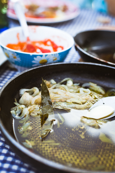 He grilled tuna and simmered it with olive oil, garlic, onion and bay leaf. On the side, a fresh chunky tomato, cucumber and onion salad and some boiled potatoes.
