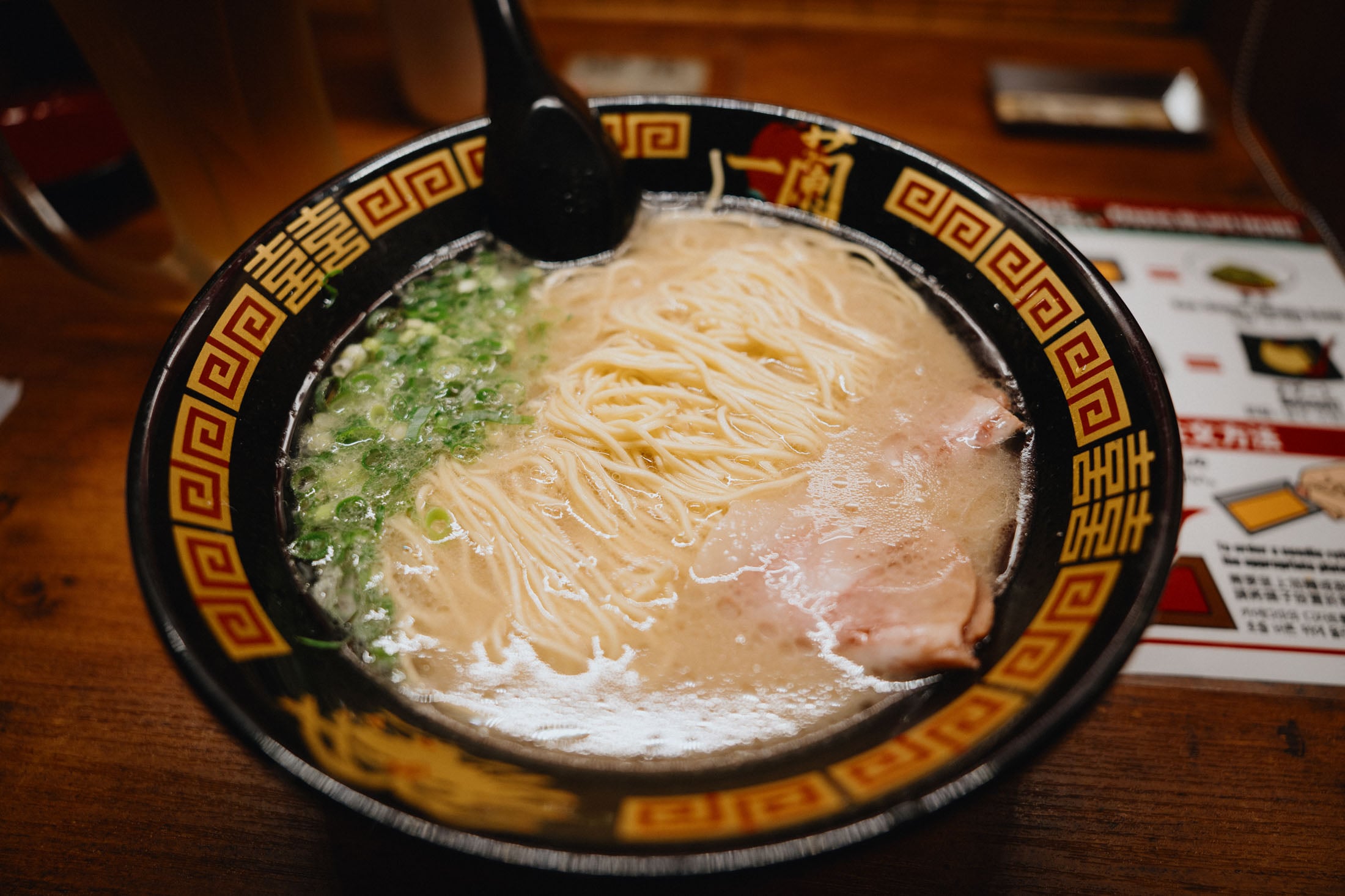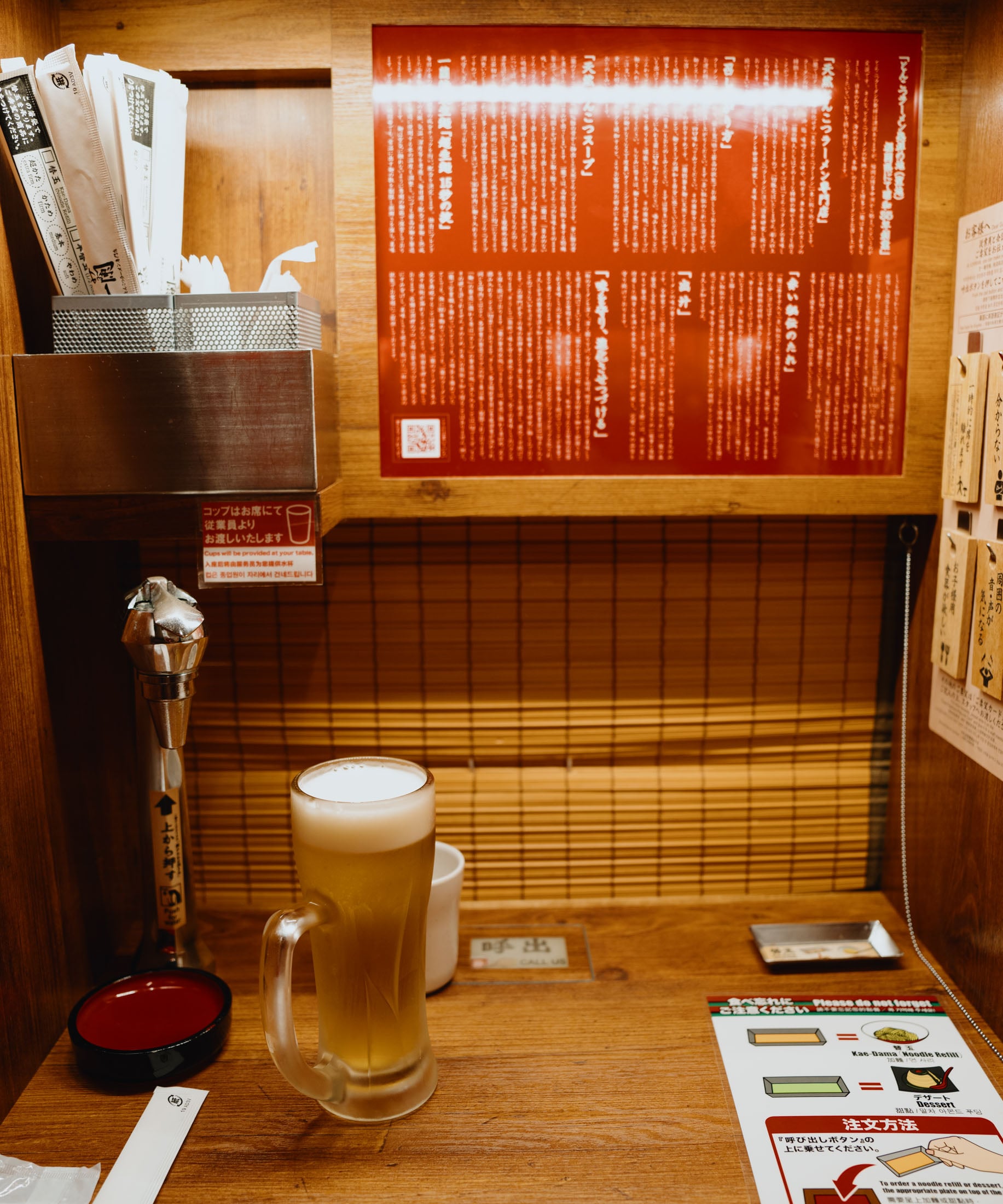 It’s not uncommon for people to have meals by themselves, so I guess this removes some weirdness of having to share the same table or space with others. You are required to interact with absolutely no one — you get a ticket from a machine at the front, sit down at your booth, and someone hidden behind a blind in your booth exchanges your ticket for your order.